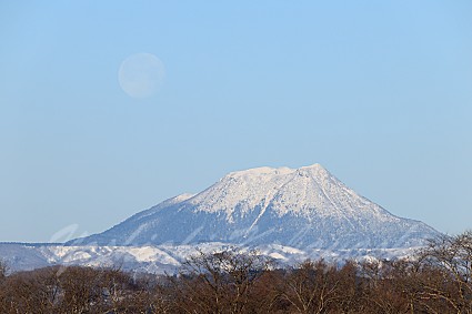 朝の景色を撮影したあと、移動していたら雄阿寒岳に月がかかりそうだった