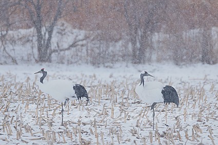 朝のうちまで雪が降り、地面が白くなる程度に積もりました。タンチョウの