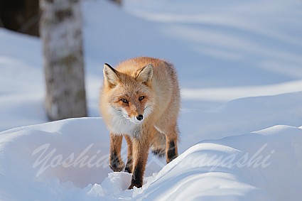 森の中でキタキツネに会いました。森の中は雪が深くなっているところもある