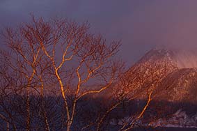 雪雲の向こう側から上ってくる朝日もなかなかいい雰囲 気ですね。だいぶ凍ってきた湖面の模様も面白かったで す。こんな空でも、午後からはスカッと晴れてしまって また違う雰囲気です。景色も行ってみないと分からない ところがありますね。