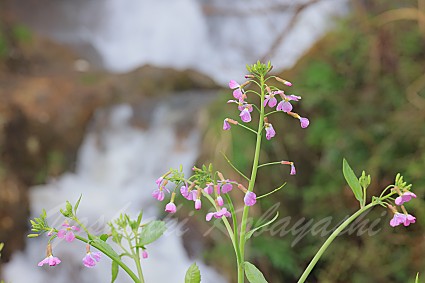 いつも移動途中に寄る滝を見てみると、周りにたくさんムラサキハナナが咲