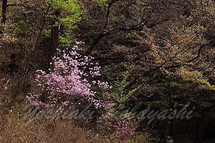妙に違う新緑の色やミツバツツジなどがあって、色とりどりです。サクラが